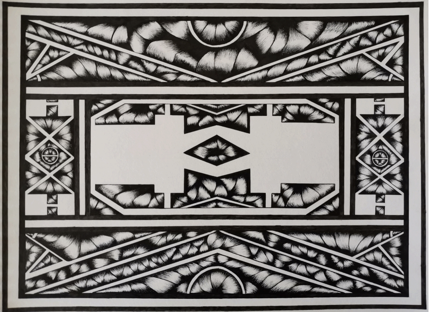 His pieces delve into identity, family history, and emotional narratives through complex line patterns and abstract designs. “My art delves into family roots, inheritance, and the silent language of patterns.” Siphiwe’s work was exhibited in galleries and the Open Window Institute.