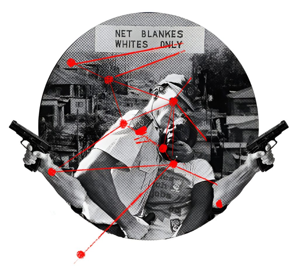 Katlego’s series investigate multiple themes. Prevalent motifs include the striped shirt (the illusion of freedom — in the form of political independence and ‘civil liberties’ — disguising persistent entrapment in systems, serving the interests of a privileged few, by design), red pants (homage to individuals who sacrificed their lives or contributed to the struggle for black liberation), and skulls/skeletons (spiritual and mental emptiness, and a biblical reference to the ‘Valley of Dry Bones,’ Ezekiel’s prophetic vision of bones being revived by the breath of God).
